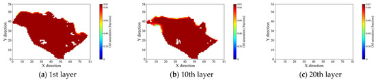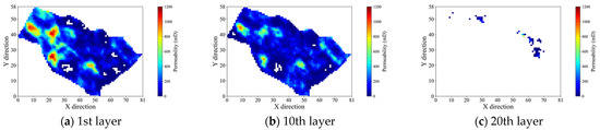 Two-dimensional permeability distribution maps of the UNISIM-I-D. (a) The 1st layer (2282 active grid blocks); (b) 10th layer (2312 active grid blocks); (c) 20th layer (65 active grid blocks).