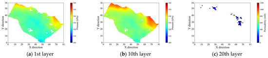 Two-dimensional pressure distribution maps of the UNISIM-I-D. (a) The 1st layer (2282 active grid blocks); (b) 10th layer (2312 active grid blocks); (c) 20th layer (65 active grid blocks).
