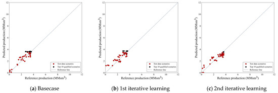 Scatter plots to compare the reference and predicted production for test data scenarios and top ten qualified scenarios for the 1st well placement problem. (a) Basecase (, ); (b) 1st iterative learning (, ); (c) 2nd iterative learning (, ).