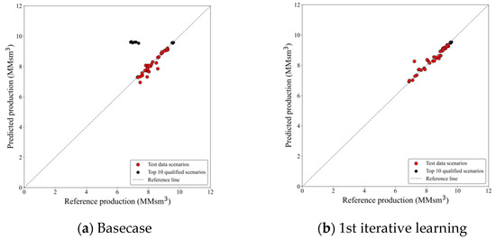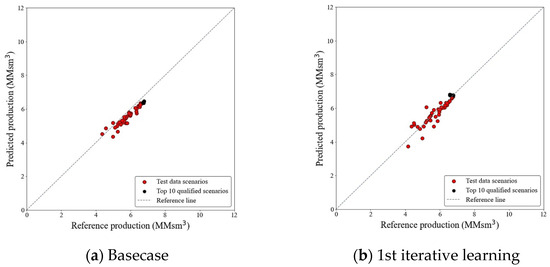 Scatter plots to compare reference and predicted production for test data scenarios and top ten qualified scenarios for the 3rd well placement problem. (a) Basecase (, ); (b) 1st iterative learning (, ).