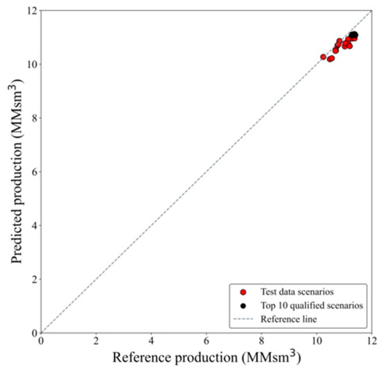 Scatter plots to compare reference and predicted production for test data scenarios and top ten qualified scenarios for the basecase of the 4th well placement problem (, ).