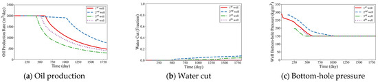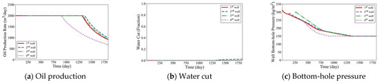 Well production profiles at the four original well locations in the original study from the original study [38]. (a) Oil production; (b) water cut; (c) bottom-hole pressure.