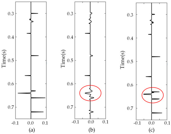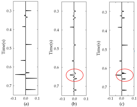 The true reflectivity series and inverted reflectivity series with synthetic seismic data in Figure 1b. (a) true; (b) IHTA; (c) IHyTA.