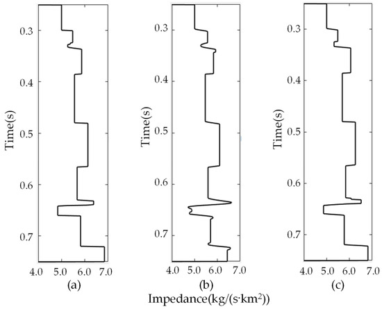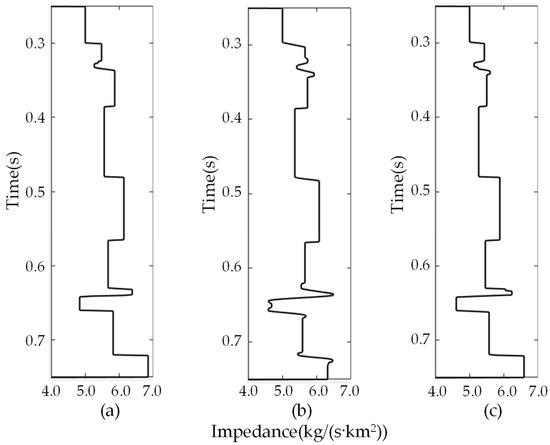 The true impedance and inverted impedance with synthetic seismic data in Figure 1c. (a) true; (b) IHTA; (c) IHyTA.