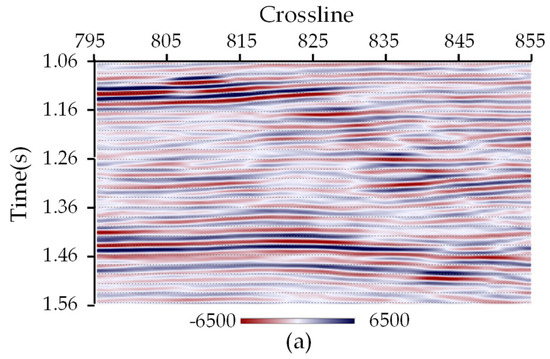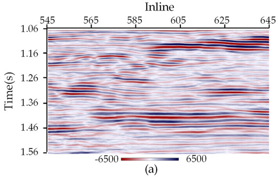 Next, in order to evaluate the applicability of IHyTA on real seismic data, we use a real 3D seismic data volume from East China. The seismic data volume includes 101 Inlines from 545 to 645, and each Inline contains 61 Crosslines from 795 to 855. 3D seismic is recorded over an area in which data is sampled densely along a regular grid and the processed output is available in a volume. On land, 3D acquisition is done with a closely spaced grid of shot and receiver points spread over an area called a “swath”. Along the swath, receivers are placed on parallel lines and shot points are positioned on parallel lines (which are the so-called Crosslines) orthogonal to receiver lines (which are the so-called Inlines).