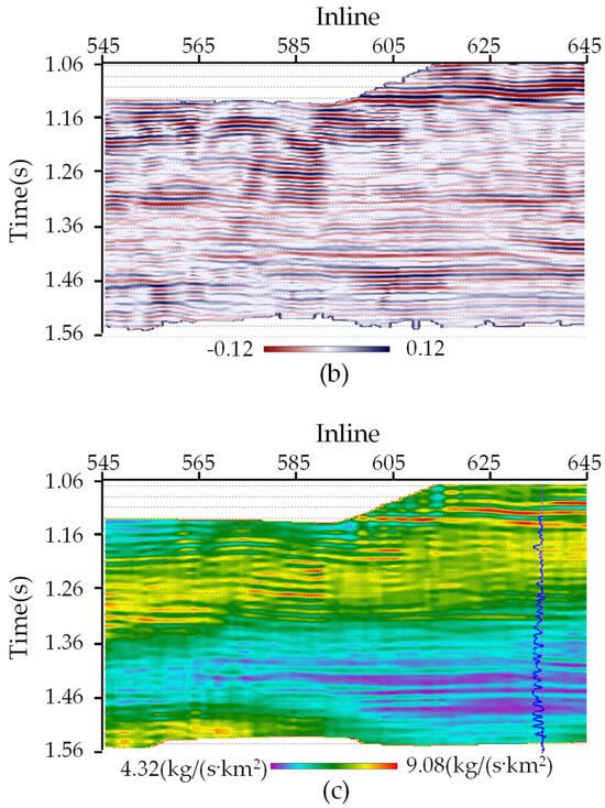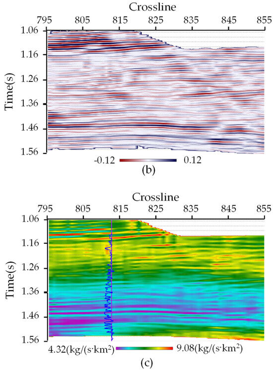 The real seismic data for Crossline 800, and its corresponding inverted reflectivity series profiles and inverted impedance profiles. (a) real seismic data; (b) reflectivity series; (c) impedance.