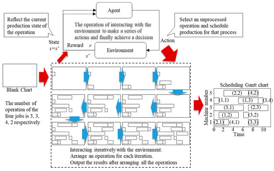 With reinforcement learning, the intelligent agent continuously learns through interactions with the environment and achieves autonomous decision making. The implementation process of production scheduling calculation based on DRL is shown in Figure 1. Through the interaction and iteration between the agent and the environment, each process is sequentially sorted. Finally, the scheduling Gantt chart is calculated.