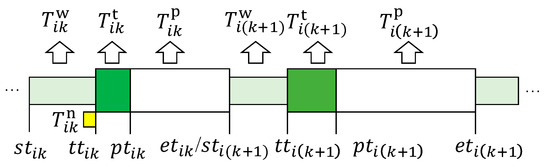 The time composition of an operation is defined as shown in Figure 2. An operation time includes waiting time (), transportation time (), and processing time (), where i is the job number, and k is the operation number. For example, represents the waiting time of the k-th operation of the i-th job. Moreover, , , , and represent the total start moment, transportation start moment, processing start moment, and total end moment of the k-th operation of the i-th job, respectively. Therefore, the makespan of a job is defined as follows:
