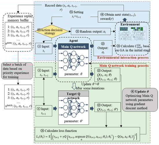 Due to the successful application of DRL in the gaming field, its application in intelligent manufacturing has also begun to be explored and studied. Li et al. [29,30] applied four of the most important RL techniques, namely, Q-learning, Sarsa, Watkins’s Q(λ), and Sarsa(λ), to the online single-machine scheduling problem. Wang et al. [31] proposed a dynamic scheduling method based on DRL. Li et al. [32] began exploring dynamic scheduling methods based on DQN, but did not fully consider the uncertainty of the production environment. Hu et al. [33] proposed a hybrid rule strategy for real-time scheduling optimization of automated guided vehicles based on DQN. Luo et al. [34] solved the dynamic scheduling problem of FJSP using a newly proposed job-insertion approach based on DQN. Traditional reinforcement learning methods such as Q-learning and Sarsa, which use tables to store action memory, are very limited. In DQN, neural networks are used to memorize behaviors, greatly improving the solution space. Therefore, it is widely used.