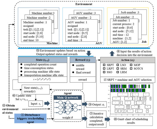 The flexible manufacturing process involves many factors, such as component installation, positioning, handling, inspection, manual operations, and order addition, which make it difficult to predict the actual process. Unpredictable sudden disturbance events such as machine failure [1], order changes [2], and processing time lag [3] will increase the deviation between actual production and the planned schedule. The randomness and frequency of sudden events will lead to uncontrollability in production management and seriously affect production efficiency. Dynamic scheduling is a method that dynamically adjusts the original plan to cope with the impact of unexpected events according to the real-time production status, which is more in line with the needs of actual complex manufacturing environments [4,5,6]. Static scheduling is generally used in the initial stage before production execution. There is usually enough computation time at this stage. We can explore high-quality solutions to complex problems through iterative optimization methods. However, it is not applicable to sudden disturbance events during execution. Therefore, there is an urgent need for a dynamic scheduling method with high responsiveness, fast feedback, and high-quality capability to solve this problem.