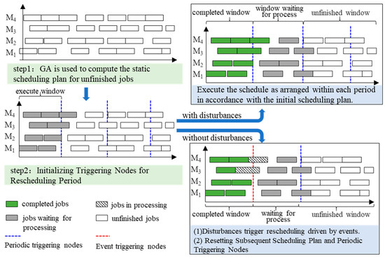 Rescheduling is the main implementation method of dynamic scheduling [7]. According to the triggering mechanism and type of sudden disturbance events, there are two key issues in rescheduling, namely, “when” and “how” to reschedule [8,9].