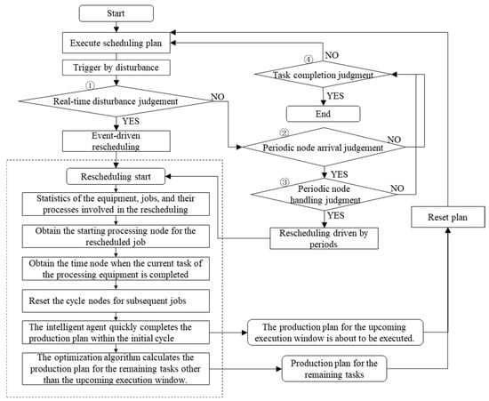 There are three typical methods for “when” rescheduling, namely, event-driven rescheduling (EDRS), period-driven rescheduling (PDRS), and event-driven and period-driven hybrid rescheduling (HDRS) [10,11]. Hamzadayi et al. [12] proposed a full rescheduling method for multiple identical parallel machines based on event-driven strategy. Ghaleb et al. [13] researched task rescheduling methods for workshop production driven by machine failure. Rensheng et al. [14] proposed a Q-Learning-based NSGA-II algorithm and event-driven rescheduling strategy. Figueroa et al. [15] proposed a dynamic rescheduling method, which triggers rescheduling when uncertain events occur. Xiaolong et al. [16] adopt an event-driven predictive–reactive scheduling method. EDRS is suitable for situations where sudden events affect normal production. When a dynamic event occurs, although new efficient scheduling can be obtained, it takes a long time to calculate. Shi et al. [17] researched dynamic scheduling methods based on rolling temporal optimization strategy driven by the period. PDRS is suitable for handling disturbance events that do not require immediate resolution. This method cannot solve the impact of sudden disturbance events. Ning et al. [18] and Baykasoğlu et al. [19] studied workshop dynamic scheduling problems using a hybrid method driven by a combination of the period and time. Youjun et al. [20] designed a hybrid rescheduling strategy that includes three rescheduling strategies for responding to the dynamic changes of a repairman. HDRS combines the advantages of the previous two methods and is more suitable for dynamic scheduling in complex practical workshops. This method can not only meet the immediate solution of emergencies, but also reduce the frequency of dynamic scheduling and increase stability.