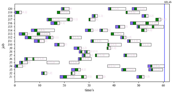 A 20-job order was randomly generated based on the Kacem 4 × 5 dataset. The order was scheduled using the genetic algorithm to obtain the initial scheduling plan, as shown in Figure 13 and Figure 14. In the GA algorithm, the population size is set to 100, the crossover probability is 0.8, the mutation probability is 0.6, and the number of iterations is 400. The objective function adopts Formula (2) in Section 2.1. These two figures represent the scheduling plan of the jobs and machine, respectively. In the figures, the blue block represents the no-load transportation process, the green block represents the load transportation process, and the white block represents the processing process. For the job scheduling plan in Figure 13, the three numbers in parentheses, respectively, represent the job operation number, the processing machine number, and the transportation machine number. For the machine scheduling plan in Figure 14, the numbers in parentheses for the processing machine, respectively, represent the job number and the job operation number, and the numbers for the transportation machine represent the job number. The final blue vertical line represents the makespan on the scheduling plan, which is 60.46.