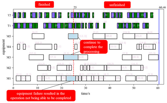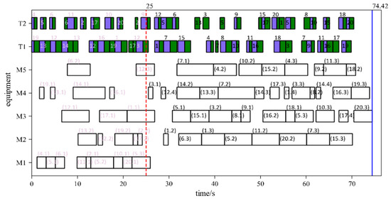 Machine failure is assumed to occur in processing machine M1 at 25 s, as shown in Figure 15. At 25 s, the jobs being processed are (5,3) on M1, (1,1) on M3, and (12,3) on M5. The jobs currently being handled by the transportation machine are (3,1) on T1 and (9,1) on T2. These processes are in progress when the disturbance is triggered.