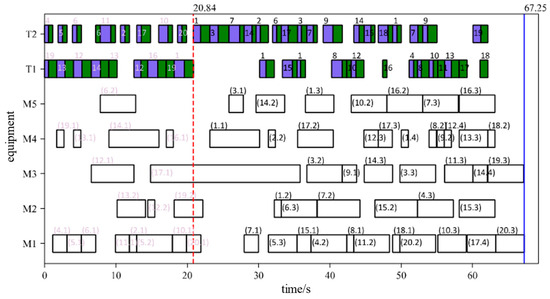 Figure 17 shows the rescheduling triggered by a processing time lag event. The triggering node is set to the normal completion time of operation (17,1), which is 20.84 s. Other operations that are being processed at this time node include (19,2) and (20,1), which will continue to be completed. The delayed operation (17,1) will continue to complete the task according to the expected delay time of 15 s. The allowed start time node for subsequent operation (17,2) is set to 35.84 s, and the allowed start time for M3 is also set to 35.84 s.