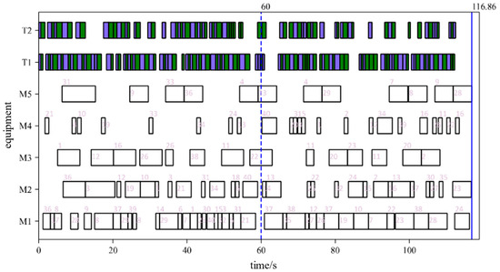 The result of rescheduling triggered by an order disturbance is shown in Figure 20. The order change occurred between 0 and 60 s, so the rescheduling was triggered at the first dynamic scheduling cycle node after the order change disturbance, which was at 60 s. At this moment, the newly added orders are included in the calculation range of the algorithm, and the tasks that need to be completed by the orders are reorganized. The original scheduling plan was executed before 60 s. After 60 s, the scheduling plan determined by the main Q-network was executed. The decision-making time was 12.45 s due to the large amount of calculation, which resulted in a corresponding increase in response time. However, it can still be considered that the algorithm quickly provided a scheduling solution.