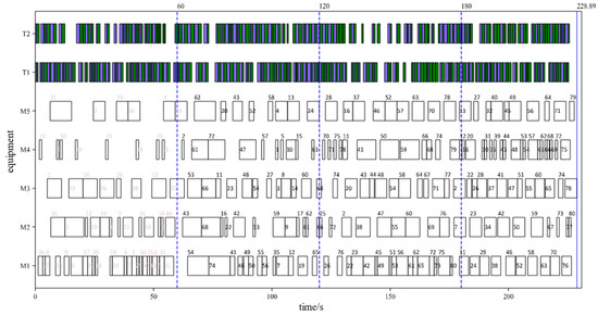 Based on the Kacem 4 × 5 dataset, orders for 40 jobs were randomly generated, and a genetic algorithm was used to calculate the production schedule for the orders. The initial scheduling plan obtained is shown in Figure 19. The cycle time was set to 60 s. Every 60 s, the system will check the current manufacturing resource information. If the manufacturing resource information has not changed, the PDRS of HDRS will not be triggered, and the production will continue according to the original plan. To facilitate the display of job information, the job number is only displayed on the processing machine.