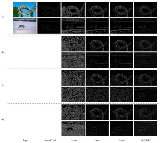 Figure 4 shows the comparison results with other competitive edge detection methods in the BSDS-500 dataset. We can observe that traditional operators tend to detect a significant number of false, noisy, and discontinuous edges, which are easily affected by noise and less robust. In contrast, our proposed smoother contours and removes irrelevant edges from the background. By examining the local edge details, it is evident that the edges reconstructed by the LOSW are finer and preserve main object structures maximally. From Table 3, the proposed LOSW-ED consistently outperforms traditional edge detection methods (Canny, Sobel, Prewitt) across all noise conditions, achieving the lowest RMSE, highest PSNR, and best FOM. On clean images, LOSW-ED obtains performance gains of 35.2%, 77.4%, and 42.3% in PSNR than Prewitt across different noise conditions. LOSW-ED demonstrates remarkable robustness, maintaining high detection accuracy with FOM values of 57.77, 58.00, and 55.64, respectively. Figure 5 and Figure 6 clearly show the improvements in robustness and detection accuracy over the compared methods.