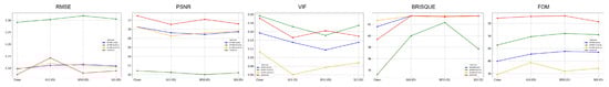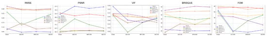 Line chart results of RMSE, PSNR, VIF, BRISQUE, and FOM for learning-based methods under different noise conditions.