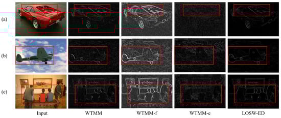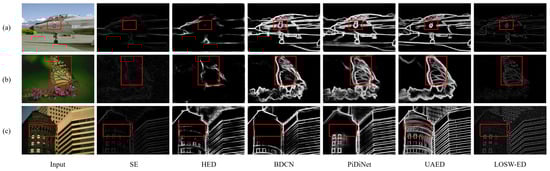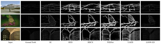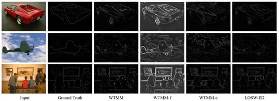 Table 4 clearly shows that LOSW-ED significantly outperforms all WTMM variants in terms of RMSE and PSNR (22.9373 dB). LOSW-ED achieves the highest FOM (57.08), which is a substantial improvement over WTMM-f and WTMM-e, highlighting its superior edge preservation and noise suppression capabilities. LOSW-ED also achieves lower BRISQUE compared to WTMM methods, indicating better perceptual quality. In addition, LOSW-ED demonstrates competitive advantages over advanced learning-based methods, achieving a second-best FOM. Although UAED achieves the highest FOM, LOSW-ED excels in PSNR, indicating a better overall noise suppression and signal fidelity trade-off. LOSW-ED also outperforms learning-based methods in BRISQUE, suggesting a more natural and visually appealing edge detection result. From Figure 7 and Figure 8, it can be seen that our method effectively preserves the edge information of primary semantic structures while detecting more visually consistent and continuous textures. In contrast, other methods, while capable of capturing major edge contours, tend to produce thicker cues and blurred edges.