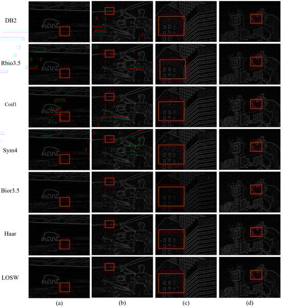 To evaluate the effectiveness and performance of the LO-spline wavelet (LOSW) for edge detection, Table 8 shows that LOSW consistently achieves the highest FOM across most noise conditions (57.08 for clean images and 57.77 under G noise) along with competitive PSNR and SSIM values, which demonstrate the consistent robustness for edge detection. These results also highlight LOSW’s exceptional balance between edge localization accuracy, noise suppression, and structural preservation. Despite slight limitations in perceptual quality metrics, LOSW excels in edge detection accuracy and continuity, making it a highly effective and reliable wavelet for edge detection tasks. Figure 12 shows that our LOSW has smoother contours, while other wavelets have more mutated edges, which verifies the leading performance of LOSW in smoothness and flexibility.