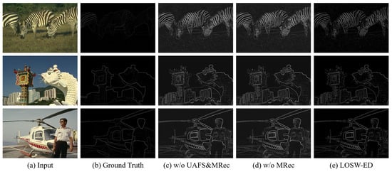 Comparison results of the proposed method under different ablations. (a) The clean inputs from the BSDS500 datasets. (b): The corresponding ground truth for the BSDS500 datasets. (c) w/o UAFS and MRec represents selecting modulus maxima based solely on the high-frequency component’s standard deviation in each block. (d) w/o MRec indicates post-processing without using morphological reconstruction. (e) The full algorithm. (d) The introduction of MRec effectively suppresses irrelevant background edges. Considering the trade-off between structural preservation and background noise suppression, (e) achieves a cleaner background and edges compared to (c).