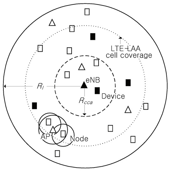It is assumed that the LTE-LAA eNB uses an omnidirectional antenna, as illustrated in Figure 5; its transmission power, denoted by , is fixed in accordance with regulations for unlicensed band usage. Let represent the received signal power at an LTE-LAA device u from the LTE-LAA eNB, and let denote the cumulative interference from concurrent transmissions by multiple WLAN nodes. Then, , where K is a constant and is the propagation loss exponent [16]. The signal to interference plus noise ratio (SINR) at the LTE-LAA device u can then be obtained as follows: