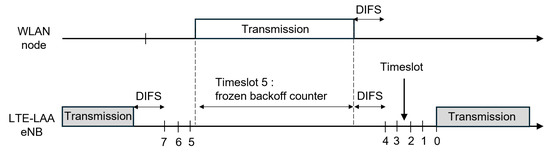 Figure 2 illustrates an example scenario of the random backoff operations of an LTE-LAA eNB. The LTE-LAA eNB and a WLAN node share the same unlicensed channel. After completing a packet transmission, the LTE-LAA eNB waits for a DIFS duration and selects a backoff counter value of 7 before transmitting the next packet. In this scenario, we assume that the WLAN node transmits a packet in the middle of the timeslot corresponding to a backoff counter value of 5 for the LTE-LAA eNB. As a result of the channel being sensed as busy, the backoff timer is frozen at 5 and resumes decrementing only when the channel is sensed as idle for a DIFS duration. As illustrated in Figure 2, the backoff counter of the LTE-LAA eNB remains frozen during the transmission of a WLAN node, which can cause the time interval between two consecutive timeslot beginnings to be significantly longer than the timeslot size, . Specifically, this interval equals the timeslot size, , when no other WLAN nodes are transmitting, but it corresponds to the time between two consecutive backoff counter decrements when transmissions from other WLAN nodes are present.