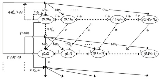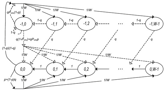 The bidimensional process can be represented using a discrete-time Markov chain, as illustrated in Figure 3. The stochastic process , representing the post-backoff stage or the backoff stage, takes values of −1 or 0, while the stochastic process , representing the backoff counter, ranges from 0 to . Thus, the state space, consisting of a finite set of states, can be expressed as follows: