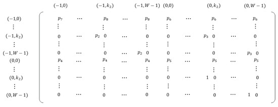 Let P denote the transition probability matrix of the Markov chain model illustrated in Figure 3. Then, using Equations (3)–(7), we can express the transition probability matrix P as shown in Figure 4.
