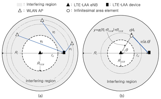 We consider a scenario where an LTE-LAA device experiences interference from transmissions by WLAN nodes located in the interfering region, as shown in Figure 5a. Let represent the distance between the LTE-LAA device and an interfering WLAN node. Figure 5b depicts a polar coordinate system centered at the LTE-LAA eNB. Let y be the distance between the LTE-LAA eNB and an infinitesimal element of the interfering region, which is given by