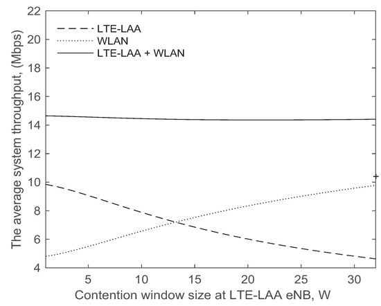 where can be expressed in terms of p, , q, and W from Equations (9), (12), and (14). Thus, given p, , q, and W, we can calculate the transmission probability of the LTE-LAA eNB using Equation (15). In Section 2.4, the transmission probability is used to calculate the throughputs of both LTE-LAA and WLAN systems.