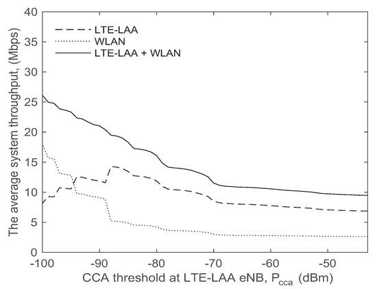 where represents the average number of WLAN nodes transmitting simultaneously within the CCA range. Let denote the SINR measured during a collision. Then, referring to Equation (16), it is given by . Thus, using Equation (21), the throughput of the LTE-LAA system is