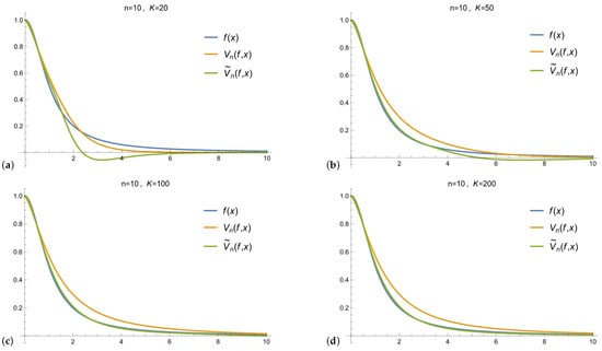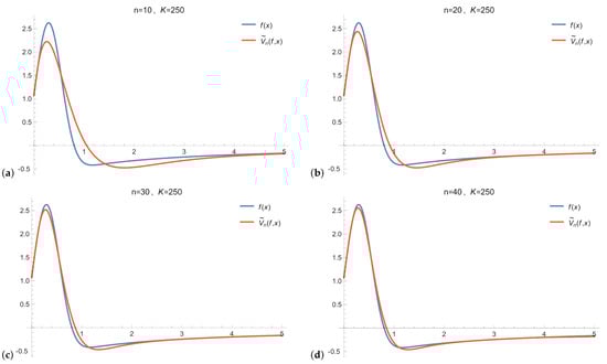 Graphs of the function , the Finta operator , and the operator for . Panel (a) the case ; (b) the case ; (c) the case ; (d) the case .