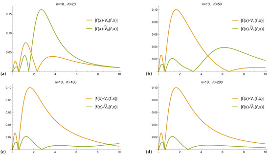 Graphs of the error functions and for . Panel (a) the case ; (b) the case ; (c) the case ; (d) the case .