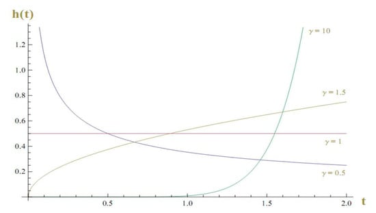 where , represent the shape and the scale parameter. The relationship between the value of and survivial time with is shown in Figure 1, which presents the hazard rates of the Weibull distribution for When , the hazard rate escalates over time. When , the hazard rate diminishes as increases. When , we have a fixed hazard rate as time increases, and this is the case of the exponential distribution.