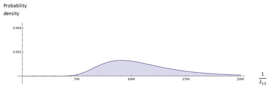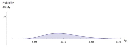 Figure 4 presents estimates related to the age at which PCDP may develop, represented by the probability density function of an inverse gamma distribution with a scale parameter of 0.0001 and a shape parameter of 10. The age at which PCDP develops is inversely proportional to . Therefore, it is reasonable to assume that the transition rate from state 1 to state 2 (normal to PCDP), , follows a gamma distribution characterized by a scale parameter of 10,000 and a shape parameter of 10. Similarly, the prior for the transition rate from state 2 to state 3 (PCDP to the clinical phase) can be established.