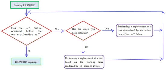 Taking these aspects into consideration, this warranty can be regarded as a renewal repair–replacement warranty with random charge (RRRW-RC), and its operational flow can be elaborated as shown in Figure 1.