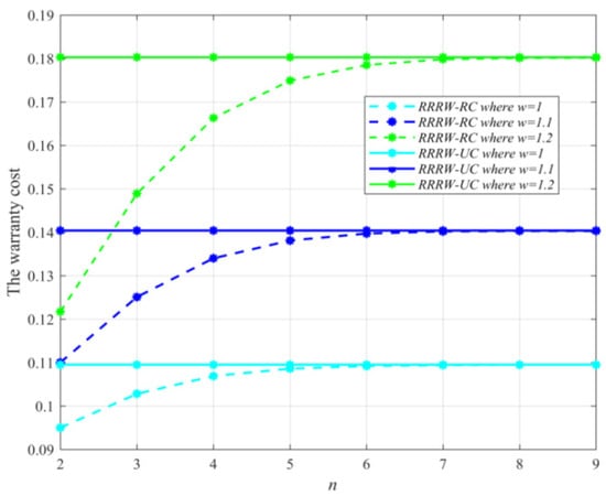 As shown in Figure 2, given , when increases, the warranty cost of the RRRW-RC increases to a constant value, which is the warranty cost of the RRRW-UC. Such a phenomenon signals that setting the number of mission cycles as a smaller value can reduce the warranty cost of the RRRW-UC to the warranty cost of the RRRW-RC. Such a result indicates that the limited number of mission cycles used as a measurement tool can recover the fractional replacement cost within the warranty stage.