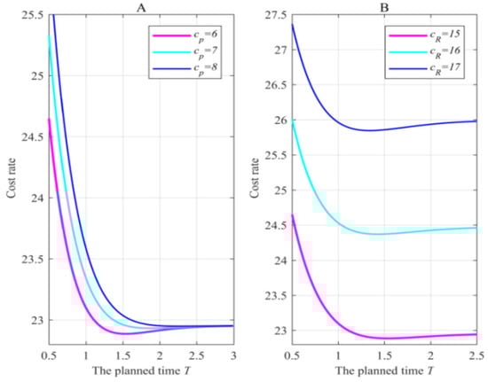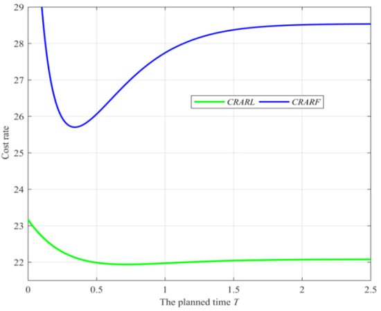 Setting , , , , , and , Figure 6 has been presented to explore the performance relationships of the CBARF and CBARL. As depicted in Figure 6, the minimum cost rate of the CBARF is higher than that of the CBARL, and the optimal time duration of the CBARF is shorter than that of the CBARL. This implies that the CBARL has a longer time duration and a lower cost rate, indicating that the performance of the CBARL is superior to that of the CBARF.