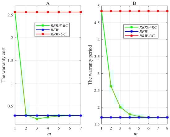 Setting , , and , Figure 5 has been presented to explore the performance relationships among RRRW-RC, RRW-UC, and FRW. Figure 5A shows that the warranty cost of the RRRW-RC decreases from the warranty cost of the RRW-UC to a minimum value and then increases to the warranty cost of the FRW. Figure 5B shows that the warranty period of the RRRW-RC decreases from the warranty period of the RRW-UC to the warranty period of the FRW. These results mean that, ① compared with the FRW, when is set as an appropriate value, the warranty cost of the RRRW-RC can be reduced and the warranty period of the RRRW-RC can be extended, namely, realizing the strategic objectives of reducing the cost and extending the period; and, ② compared with the RRW-UC, when is set as a smaller value, the warranty cost of the RRRW-RC can be reduced while the warranty period of the RRRW-RC cannot be extended.