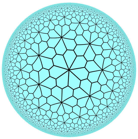 Figure 1. Poincaré disk model 𝔻 of the hyperbolic plane, shown with pentagonal tiling to illustrate geodesics between embedded points. Source: https://commons.wikimedia.org/wiki/File:7-3_floret_pentagonal_tiling.svg, downloaded on 26 November 2024.