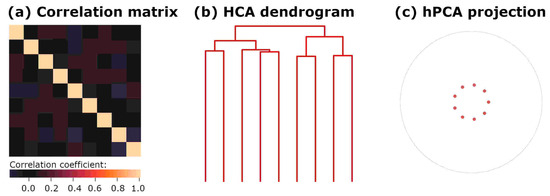 Figure 4. Correlation structure and analysis for Experiment 3. (a) Data correlation matrix. (b) Hierarchical clustering with Ward’s linkage. (c) hPCA results projected onto the Poincaré disk 𝔻.