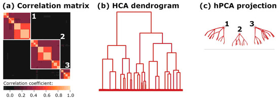 Figure 3. Correlation structure and analysis for Experiment 2. (a) Data correlation matrix, with large-scale structures labeled 1, 2, and 3 highlighted in white. (b) Hierarchical clustering with Ward’s linkage. (c) hPCA results projected onto the Poincaré upper-half plane 𝕌, with labels corresponding to (a).