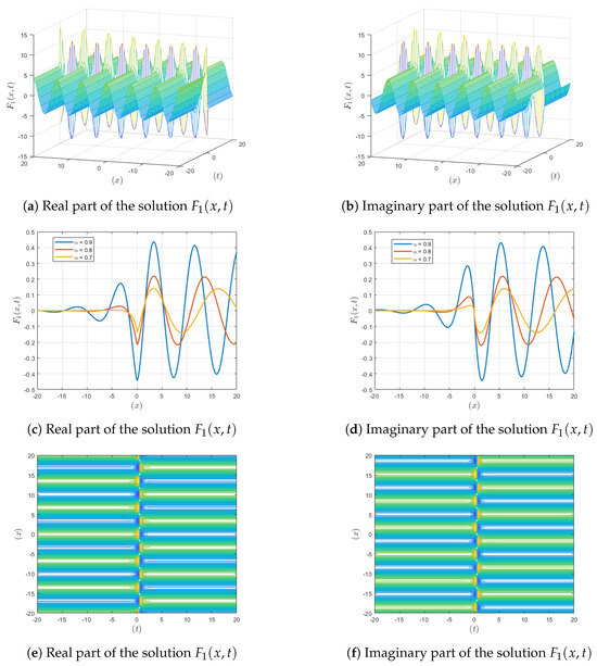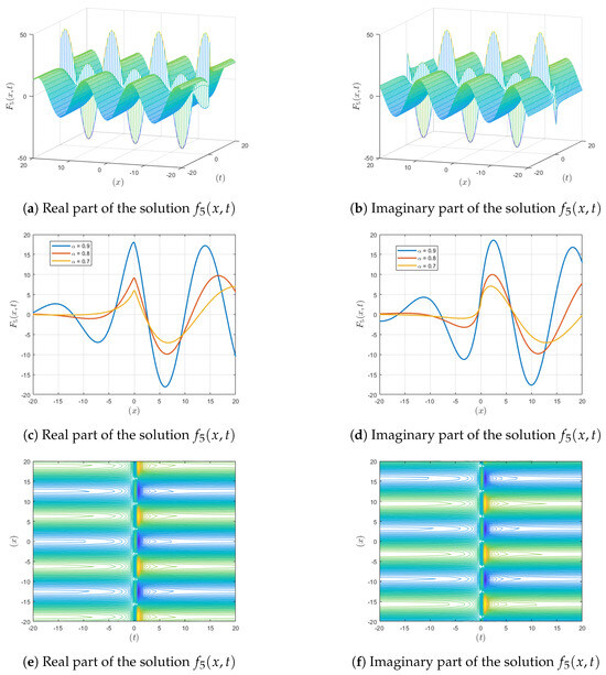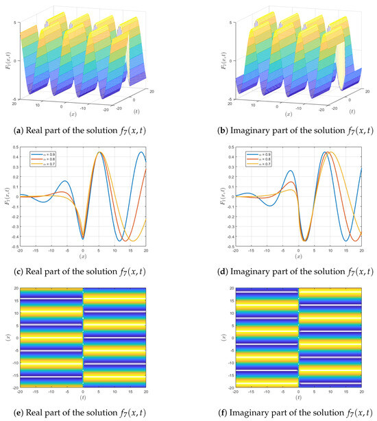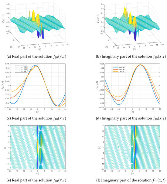 In this regard, the two cases obtained using the algebraic system described above may be used to identify families of solutions with regard to . These solution families show different behaviors of the system in different cases. The emergent solution behaviors reveal the temporal dynamics of the system, as well as the physical manifestations and mechanisms under a variety of fractional-order controls and initial states. Moreover, these families of solutions include all the interconnections distinguished in the system, while revealing the impacts of different on soliton behavior and stability, and it has significance for fluid dynamics and nonlinear waves.