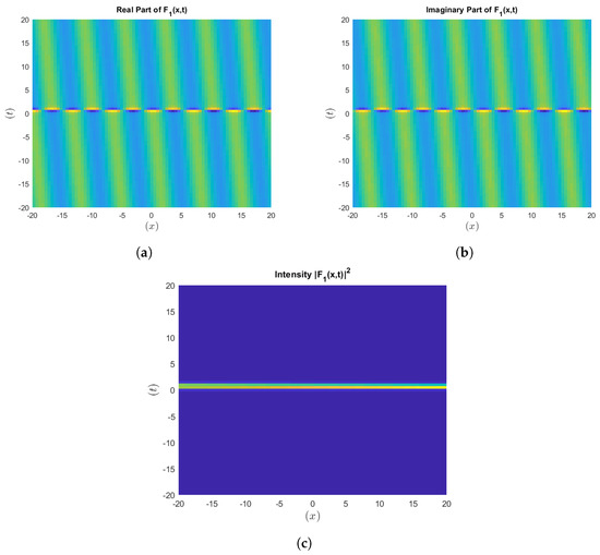 From here, we concentrate on solving Case 1 by inserting the obtained values of () and reveal a set of unique solutions for Equation (1). The solutions obtained here have periodic perturbations in solitons, which suggests that the soliton profile oscillates temporally within this setting. All such fluctuations indicate that the solitons undergo rhythmic disturbances that affect their amplitude as well as stability. This is important for the analysis of the time dependence of the behavior and possible resonances in the system under changes in conditions.