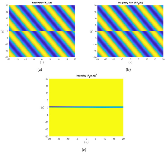 Figure 4: Unlike the other figures, there is no superposition; the periodically interrupted oscillation is constant at any fractional values of the parameter. Both the real and imaginary components exhibit oscillation, with the constant amplitudes signifying the capability for energy storage in long-term periods. Moreover, the representation of the integer order exhibits persistent periodicity, which is useful in cases when regular oscillatory behavior is needed, such as in wave guides or optical lattices. The contour plots of the displays are self-similar throughout the periodic wave, which is useful in fields where stable fractal wave structures are employed for unbroken signal transmission, such as the fractal antennas used in telecommunications. Figure 5, Visualization of the intensity of of sub-figures (a), (b) and (c). Figure 6, Visualization of the intensity of . Figure 7, Visualization of the intensity of of sub-figures (a), (b) and (c).