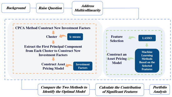 To address the problem of multicollinearity in asset pricing, this paper adopts the following two research strategies: on the one hand, constructing new factor investment models based on machine learning methods; on the other hand, directly using the Lasso method to deal with multicollinearity among feature indicators. Then, by comparing the performance of the two strategies, the optimal model is identified. Finally, an in-depth analysis and discussion are conducted on the significant feature indicators and investment portfolios of the optimal model. The flowchart is shown in Figure 2.