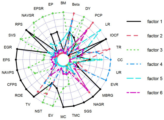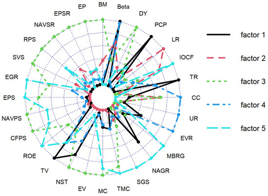 When k = 4 (refer to Figure A4), the feature indicators are classified into four distinct groups: Factor 1 comprises metrics such as ROE (Return on Equity), SGS (Stock Growth Score), NAGR (Net Asset Growth Rate), MBRG (Main Business Revenue Growth Rate), and PCP (Price Change Percentage); Factor 2 encompasses LR (Liquidity Ratio) and IOCF (Incremental Operating Cash Flow); Factor 3 includes BM (Book-to-Market Ratio), EP (Earnings-to-Price Ratio), EPSR (Earnings per Share to Price Ratio), NAVSR (Net Asset Value to Price Ratio), RPS (Revenue per Share), SVS (Stock Value Score), EGR (Earnings Growth Rate), EPS (Earnings per Share), NAVPS (Net Asset Value per Share), CFPS (Cash Flow per Share), NST (Number of Shares Traded), EV (Enterprise Value), MC (Market Capitalization), and TMC (Total Market Capitalization); Factor 4 encompasses EVR (Earnings Volatility), UR (Unsystematic Risk), CC (Correlation Coefficient), and TR (Turnover Rate). Based on the insights from the existing literature (Li et al., 2019 [22]; Gu et al., 2020) [6], Factor 1 is suggested to emphasize profitability, Factor 2 to highlight liquidity, Factor 3 to focus on value considerations, and Factor 4 to address risk factors.