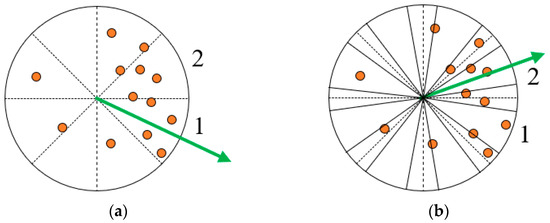 We divide the projection plane in the neighborhood into multiple equal-angle fan-shaped regions, with each region spanning 10 degrees. All the projection points are then categorized into their respective fan-shaped regions. We select the fan-shaped region with the maximum number of points as the dominant direction for the x-axis. However, due to noise interference, some points may be shifted to adjacent regions. As shown in Figure 2a, a point originally in fan region 2 may be shifted by noise into fan region 1, leading to the wrong dominant region being selected. To reduce the impact of noise, we expand the boundaries of each fan-shaped region outwards by 0.5 degrees. This creates a 1-degree overlap between adjacent fan regions, and points in the overlapping area are considered to belong to both neighboring regions. As illustrated in Figure 2b, the influence of noise on the boundary regions is reduced with this approach. By using this improved neighborhood projection method with overlapping fan regions, the computed x-axis direction becomes more robust to noise interference on the local surface.